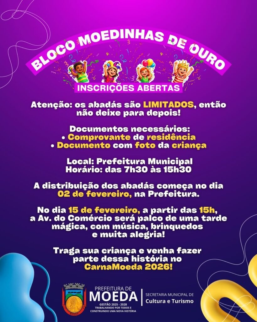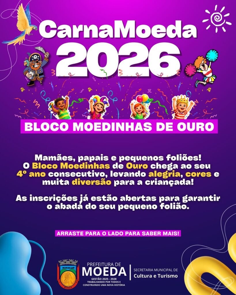 O Carnaval de Moeda em 2026 reserva um espaço especial para os pequenos foliões. O Bloco Moedinhas de Ouro chega ao seu 4º ano consecutivo, prometendo levar muita alegria, cores e diversão para as crianças da cidade. Para garantir a participação e o abadá do seu “pequeno folião”, os responsáveis devem ficar atentos ao prazo e aos documentos necessários, já que as unidades são limitadas.